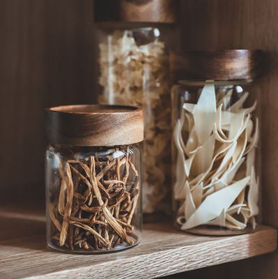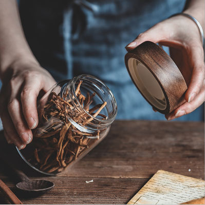 โลโก้ที่กำหนดเองเป็นมิตรกับสิ่งแวดล้อมฝาไม้เปล่าล้างถังครัวขวดแก้วใส
