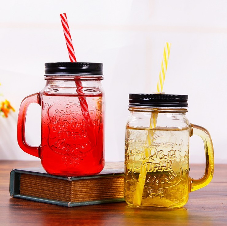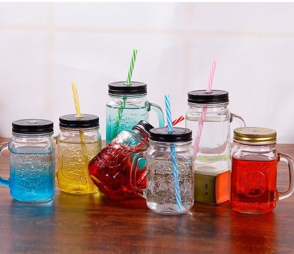 ขวดแก้ว Mason Jar สีสันสดใสพร้อมที่จับปากขวดแบบธรรมดา
